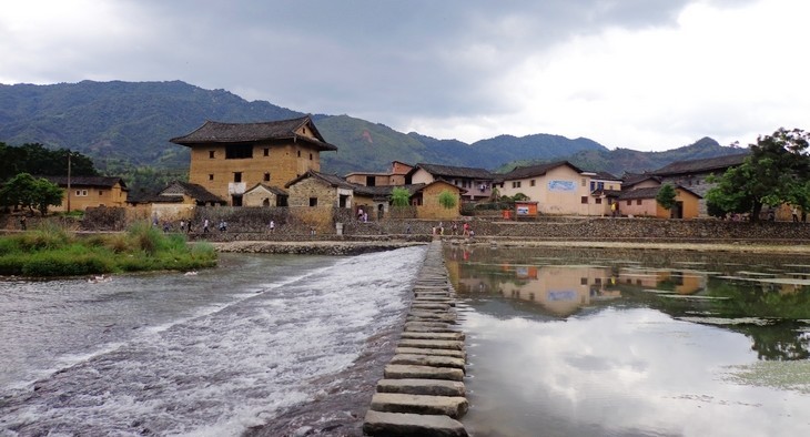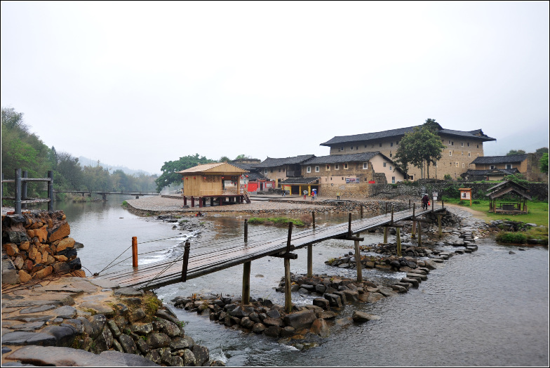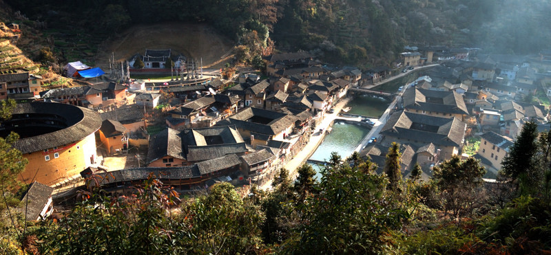 位于福建省漳州市南靖县书洋镇西部,是漳州著名的侨乡,也是首批15个中国景观村落之一。被誉为“闽南周庄”,这个村的历史悠久, 建于1426年,现有300多户人家,土楼沿河而建,并非常均匀地分布在两岸,土楼形态丰富,有常见的方形、圆形土楼,还有围裙形、曲尺形土楼,最独特的是还有浙杭水乡模式单院式土木、砖木结构的吊角楼,形成大楼带小楼、高低错落布局的奇妙景观。