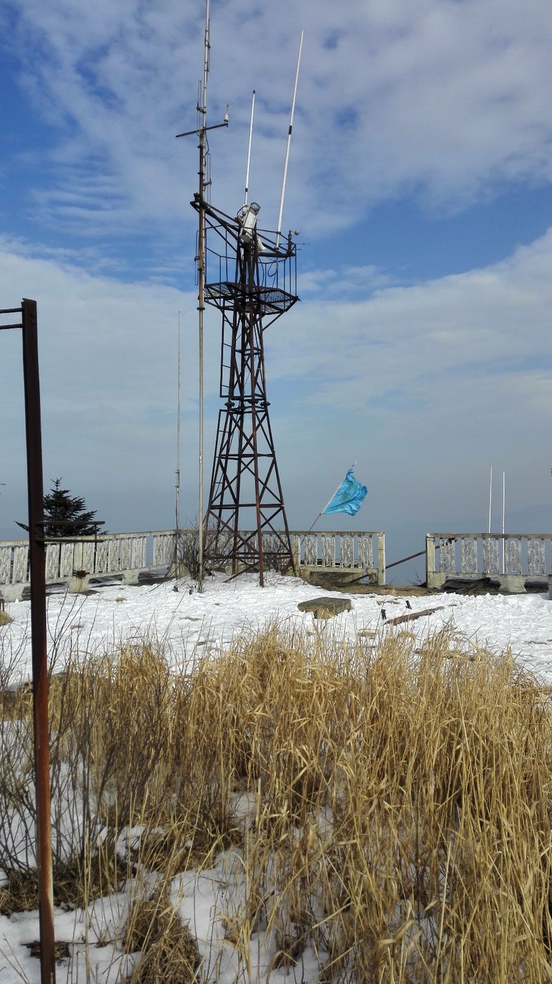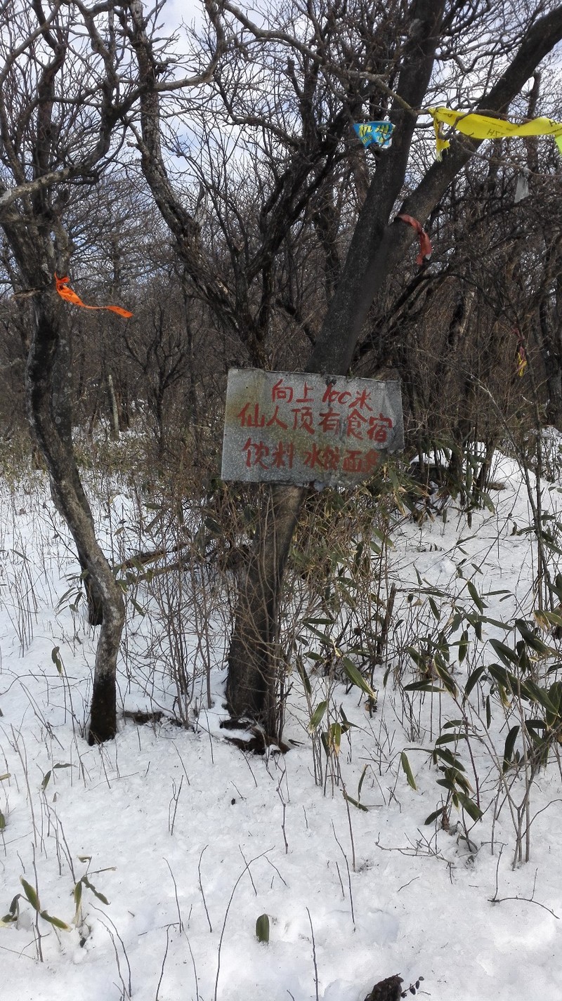 上得“珠峰”,沿山脊前行。虽说是山脊,但很宽阔。有积雪,有树木,有怪石,有界碑。远处山峰便是此行最高峰——仙人顶。